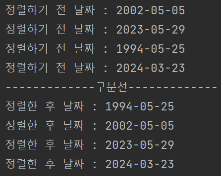 예제에서는 연도를 전부 다르게 했지만 연도가 같더라도 월,일에 따라서 정렬이 된다.