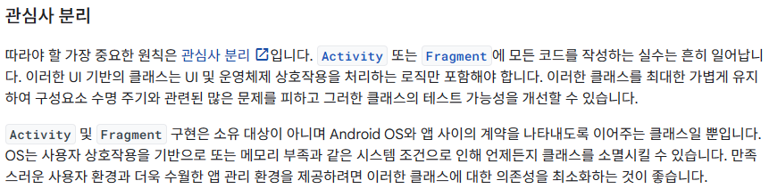 일반적으로 Activity나 Fragment는 UI 및 운영체제 상호작용을 처리하는 로직만 포함을 해야하고