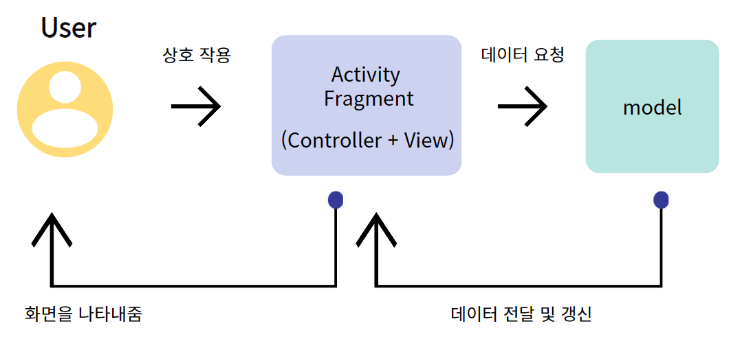 View 와 Controller가 Activity , Fragment 에 합쳐져 있다.