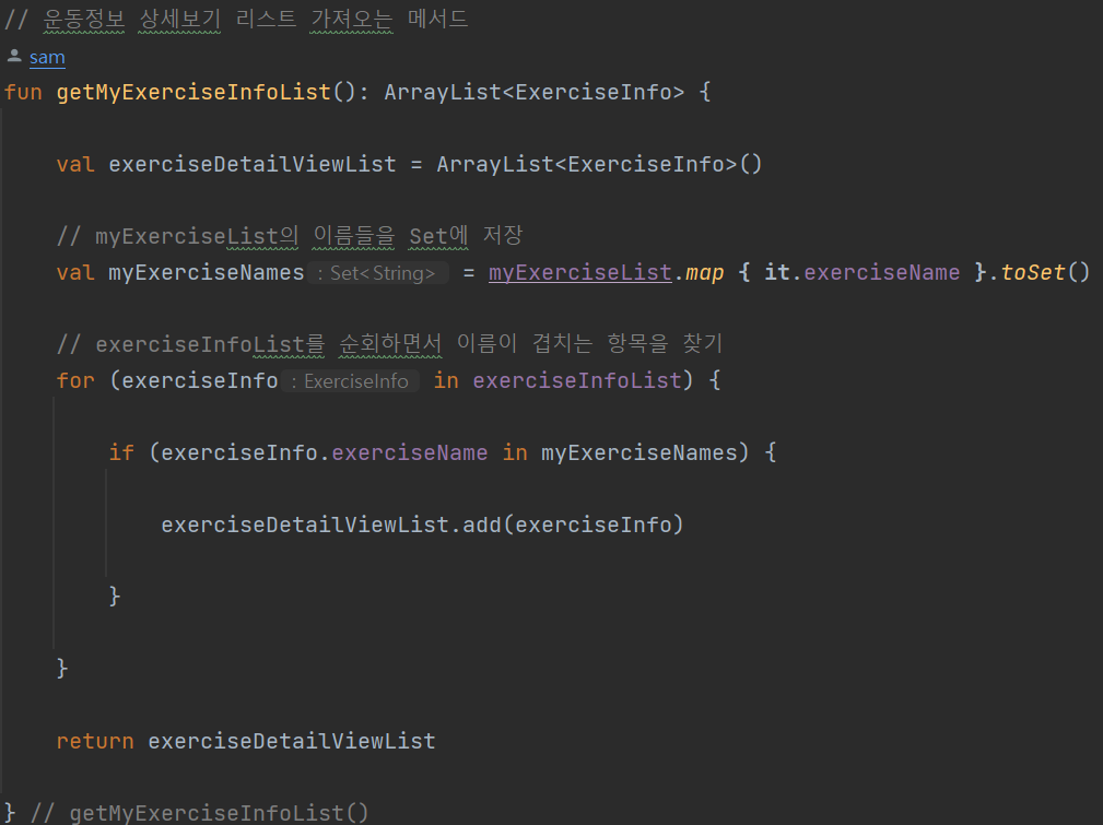 그래서 이걸 이용하여 리스트를 순회하며 exerciseInfoList라는 전체 운동 리스트중에