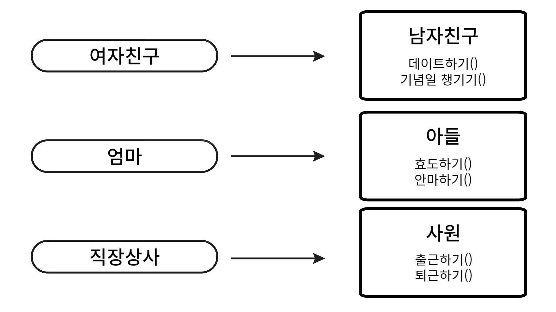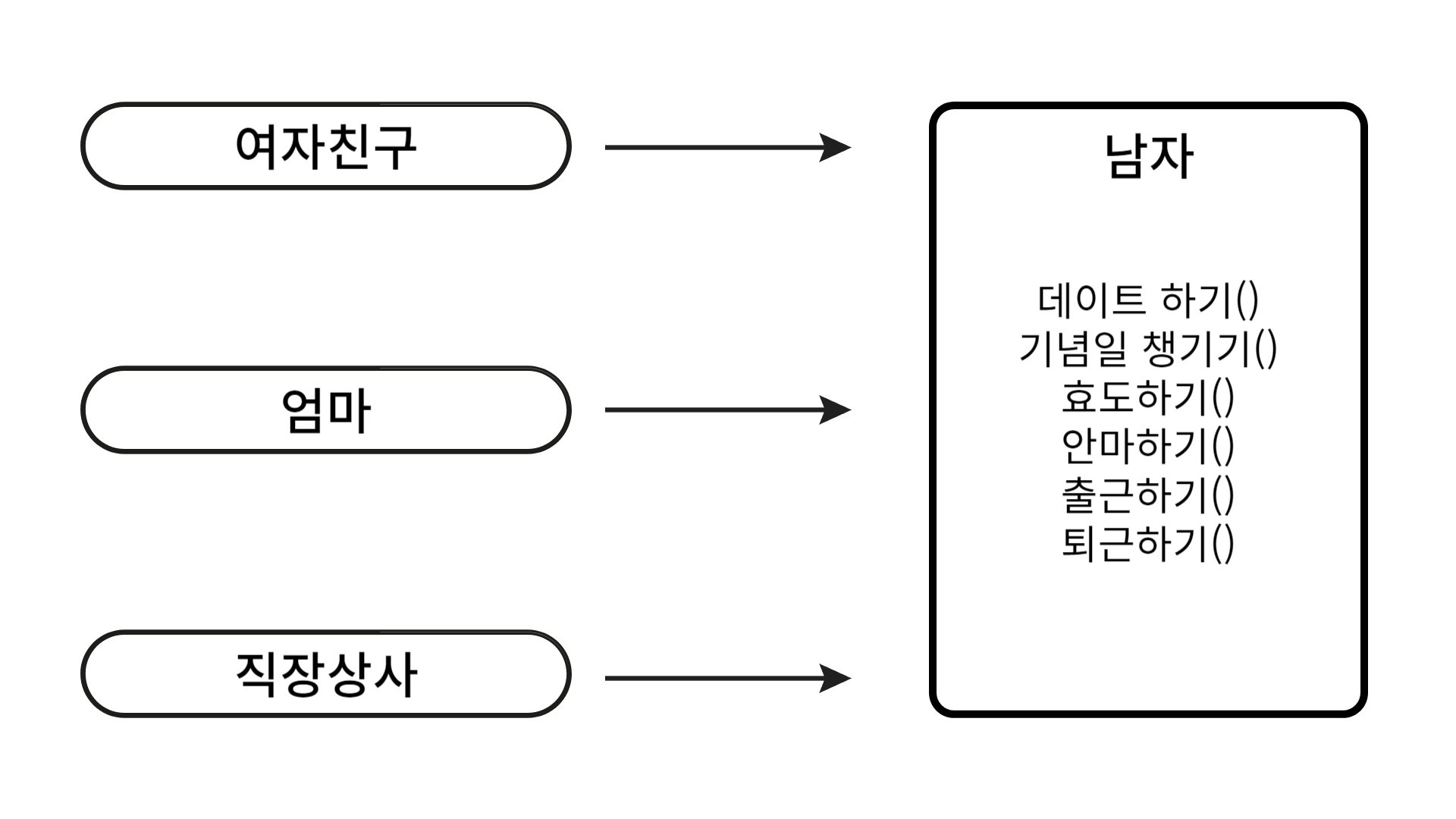 남자 클래스는 여자친구 클래스, 엄마 클래스, 직장상사 클래스, 3가지 클래스에 대한 책임을 지고 있는것이다.