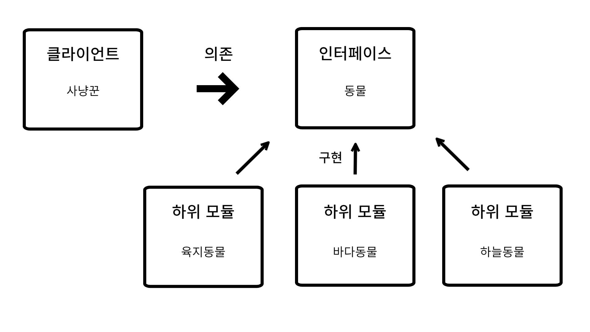 이렇게 육지동물 , 해양동물 , 하늘동물 class에 상위 모듈인 Animal Interface를 이용해 Hunter class를 수정해보자.