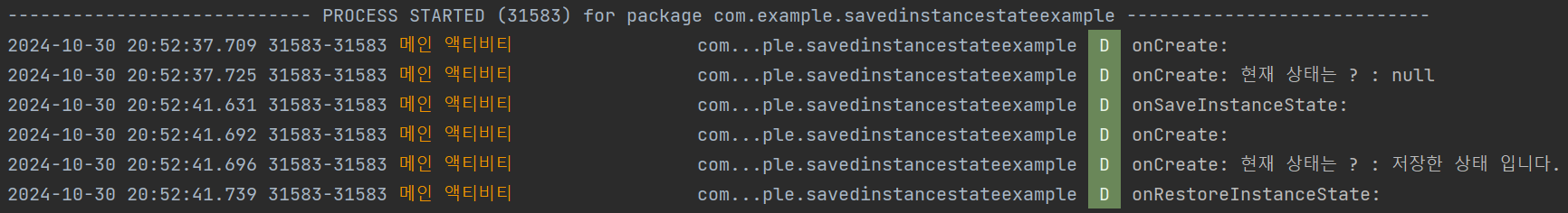 onSaveInstanceState()가 호출되었기 때문에 "저장한 상태 입니다." 값을 정상적으로 가져오는걸 볼 수 있다.