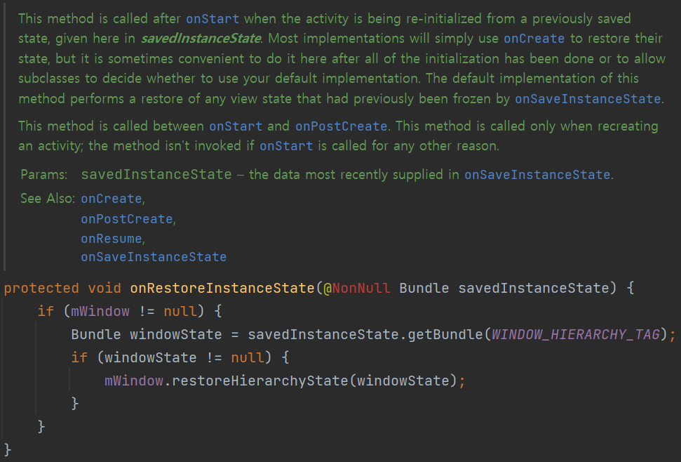 이 메서드는 savedInstanceState에 제공된 이전 상태에서 액티비티가 다시 '초기화'될 때 onStart 이후에 호출됩니다.