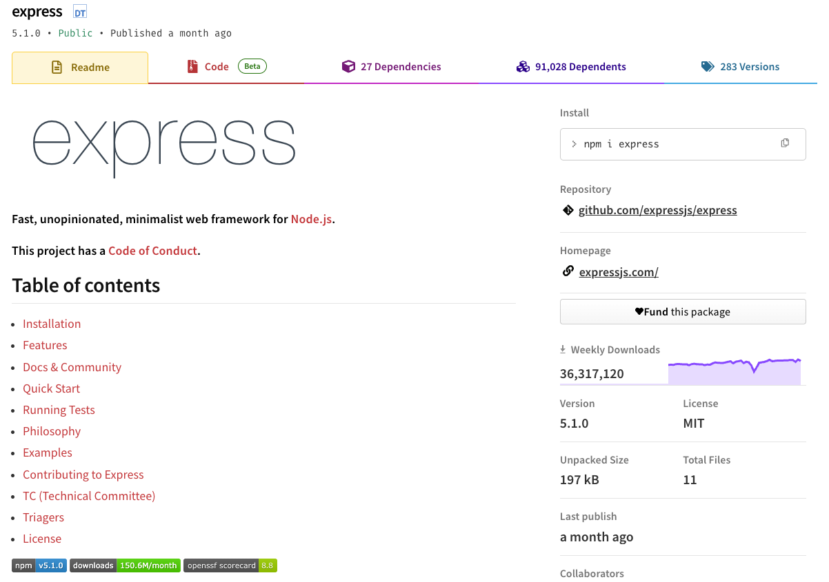 먼저 npm(node package manager) 사이트에 들어가서 express를 검색해보면