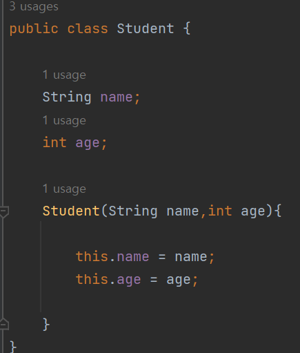 위 코드는 이름과 나이를 갖고 있는 Student 클래스 이다.